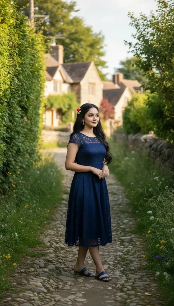 Create a hyper-realistic full-body portrait of the same girl, preserving her exact facial identity with strong identity lock across all facial structures. Maintain complete accuracy of her eyes, eyebrows, eyelid depth, nose geometry, nostril shape, lips, cheeks, jawline, chin contour, skin texture, natural asymmetry, and hairstyle. No beautification or structural edits—identity must remain 100% unchanged. ENVIRONMENT — RAIN-FRESH GARDEN PATH • Lush green tropical pathway, glistening softly after recent rain. • Tall plants on both sides forming a natural frame. • Moist ambience with rich greens and subtle reflections on leaves. • Background softly blurred for cinematic depth while keeping the subject crisp. POSE — PRECISE DESCRIPTION • She stands gracefully, shifting weight onto her back leg. • Front leg relaxed forward, forming a natural S-curve silhouette. • Right hand lifts a rainbow umbrella above her shoulder with a gentle elbow bend. • Umbrella shaft angled diagonally through the frame; umbrella slightly forward, never blocking her face. • Left hand rests lightly on her saree pallu at the waist in an elegant traditional gesture. • Chin slightly lifted; eyes looking into the distance with a calm, confident mild smile. OUTFIT — EXACT TRADITIONAL DETAIL • Bright lime-green silk saree with golden circular motifs. • Smooth drape with neat, structured pleats falling to the ground. • Contrasting royal-blue pleated section with heavier texture and woven patterns. • Deep blue blouse with short sleeves and intricate golden embroidery. • Jewelry: layered oxidized-silver temple set — choker + long necklace + earrings + bangles + maang-tikka. • Hair: long, thick braid adorned with soft accessories, traditional and elegant. RAINBOW UMBRELLA — ACCURATE DESCRIPTION • Large umbrella with multicolored panels from red → violet. • Metallic ribs visible; black central shaft. • Slightly oversized scale for dreamy monsoon aesthetic. • Soft colored reflections on raindrops and faint reflections on saree—but never altering skin tone. LIGHTING — CINEMATIC NATURAL • Soft, diffused daylight enhanced by rain atmosphere. • Gentle highlights on jewelry, saree folds, and braid texture. • Moist greenery glows with subtle reflected light. • Subject remains the sharpest element; environment stays softly atmospheric. BODY PROPORTIONS • Slim-to-medium, natural, consistent with reference identity. • Realistic fabric weight, correct gravity, authentic limb proportions. FINAL OUTPUT REQUIREMENTS • Hyper-realistic full-body portrait. • Strict identity lock (no facial changes). • Rainbow umbrella + monsoon garden aesthetic. • Sharp subject with cinematic soft-depth background. • Natural elegance, cultural authenticity, and complete realism.