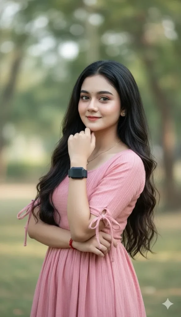 Create an ultra-realistic outdoor portrait of the same girl, preserving her full facial identity with strict token-weighted locking across all identity components. Do not beautify, reshape, smooth, or alter any real facial proportions—identity must remain exact while allowing natural expression. IDENTITY LOCK (TOKEN WEIGHTS) • Face identity overall: 1.6 • Bone structure (forehead curvature, cheekbones, jawline, chin): 1.5 • Eyebrows (angle, arch, density): 1.45 • Eyelid depth & fold: 1.5 • Eyes (shape, spacing, micro-details): 1.55 • Nose structure (bridge, tip, nostrils): 1.5 • Lips (shape, fullness, curvature): 1.5 • Jawline & chin contour: 1.45 • Skin texture & micro-details (pores, fine lines): 1.5 • Natural micro-asymmetry: 1.45 Only mild tonal/DR balancing allowed to integrate with daylight—no structural changes. POSE & ANATOMY (RECREATE EXACTLY) • Full pose: she stands relaxed with torso angled slightly to her left (viewer: right shoulder lower), producing a gentle diagonal shoulder-to-waist flow. • Right hand: raised near the chin, fingertips resting softly under the jawline as if framing the smile—keep finger placement and spacing identical to reference. • Left arm: folded lightly across the abdomen supporting the right elbow naturally; elbow position and forearm angle must match reference precisely. • Head tilt: a few degrees toward raised hand; eyes look directly at the camera with a soft, genuine smile that lifts the cheeks. Preserve exact micro-expression. • Hair: extremely long, falling over the right shoulder in a smooth vertical flow; a few loose strands frame the face naturally—retain original hair direction and texture. OUTFIT COLOR TRANSFORMATION (PINK VARIANT — DESIGN IDENTICAL) • Keep dress design identical to reference: square neckline, short sleeves with tied bows, soft waist gathering, vertical micro-striped texture. • Change only fabric color to a pleasant pink tone (maintain shading & highlights consistent with lighting). • Preserve all fabric details: micro-stripes, stitching, seam placement, bow ties, and how fabric folds around the waist and sleeves. • Do NOT alter fit, proportions, or how clothing interacts with body posture. ACCESSORIES (PRESERVE EXACTLY) • Black smartwatch on right wrist — exact position, band width, and reflectivity. • Red bracelet on left hand — exact placement and size. • Small pendant necklace at neckline — keep size, position, and chain behavior identical. BACKGROUND & LIGHTING • Outdoor softly blurred greenery ambience with gentle daylight tones and smooth bokeh. • Diffused natural light highlighting cheekbones, lips, and hair texture with subtle rim and soft falloff. • Maintain color realism for environment while keeping subject crisp and identity-accurate. CAMERA & FRAMING • Full-body vertical portrait framing, waist-up to full head (or as in reference). • Natural perspective, slight camera angle to preserve the left-angled torso effect. • Face must remain the primary focus, razor-sharp and identity-faithful; depth-of-field softens background only. OUTPUT REQUIREMENTS • Photorealistic, editorial-grade image. • Absolute identity fidelity — no identity-altering edits. • Only change: dress color to pink (no structural or stylistic changes). • Maintain exact pose, hand placement, hair flow, and accessory positions as in reference.