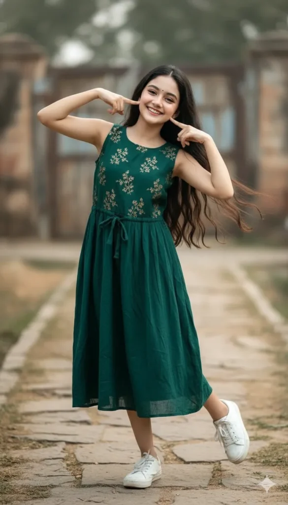 Create an ultra-realistic portrait of the same girl while strictly preserving her exact facial identity using weighted identity locking. Maintain bone structure, forehead curvature, cheek definition and jawline (1.5), eye shape, lid depth, spacing and natural childlike softness (1.55), iris clarity (1.4), eyebrow density and curvature (1.45), nose shape including bridge, tip and nostril geometry (1.55), lip contour and smile curvature (1.55), natural skin texture and youthful smoothness (1.5), hairline behaviour and strand direction (1.45), ear geometry (1.35), and all inherent micro-asymmetry (1.5). Identity must remain perfectly consistent with the reference image. POSE — PLAYFUL & YOUTHFUL • Stand lightly on one leg with a soft inward bend of the knee for cheerful balance. • Feet slightly apart in a relaxed, childlike stance. • Torso upright with a gentle forward lean conveying innocence. • Arms lifted outward on both sides, elbows slightly bent. • Both index fingers gently touch the corners of her smiling cheeks. • Fingers remain soft and curved, never rigid. • Expression: bright, wide smile with visible teeth, lifted cheeks, sparkling eyes. • Gaze directed slightly toward the camera, maintaining lively charm. OUTFIT DETAILS • Sleeveless deep-green midi dress with delicate gold floral patterns across bodice and skirt. • Fabric appears soft, lightweight, and gently wrinkled with natural movement. • Tied waist detail adds shape without maturing the look. • Long wavy hair flows naturally down her back and over shoulders, softly wind-touched. • Casual white sneakers with subtle wear for authentic realism. BACKGROUND & MOOD • Outdoor environment inspired by mood, not copied from reference. • Soft earthy tones with an old stone walkway or aged path. • Blurred rustic vertical textures suggesting weathered structures. • Mild greenery and atmospheric depth for a natural outdoor feel. • No text, logos, or symbols. LIGHTING & CAMERA • Gentle natural light with a soft key from camera-left highlighting smile and eyes. • Smooth shadow falloff to preserve youthful softness. • Slightly below eye-level camera angle to enhance playful innocence. • Portrait focal length maintaining natural proportions and smooth bokeh. FINAL OUTPUT REQUIREMENTS • Ultra-sharp facial detailing with flawless identity preservation. • Natural skin texture with no artificial enhancement. • Expressive, joyful mood captured authentically. • Photographic realism with smooth, cinematic finish.