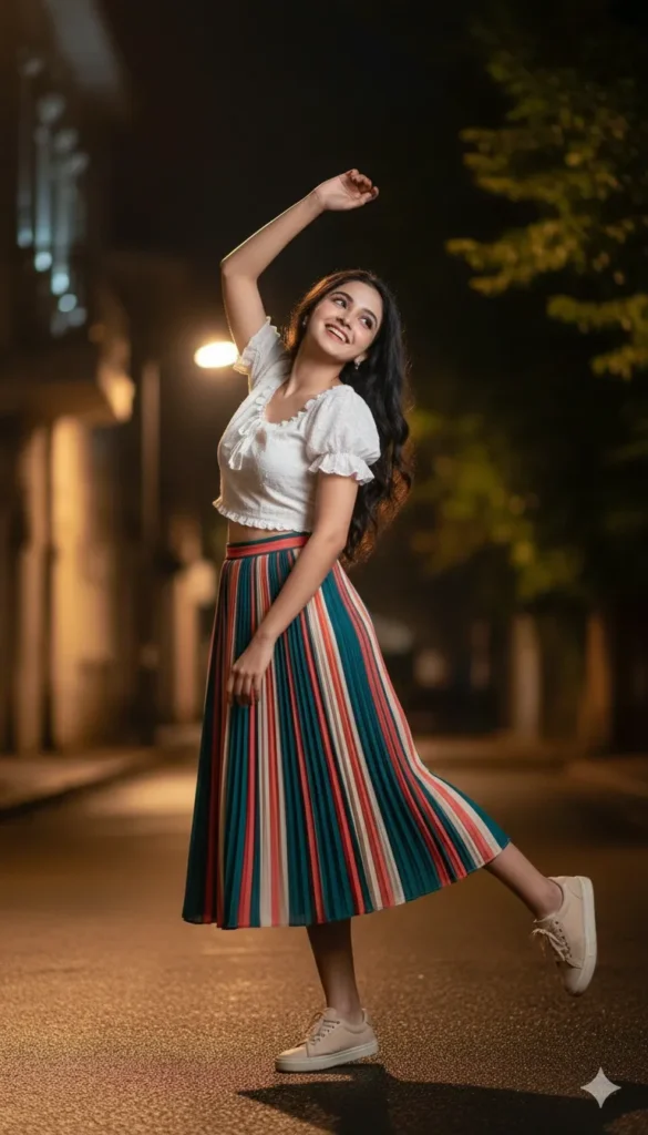 Create a hyper-realistic full-body portrait of the same girl, preserving her exact facial identity with strong token-weighted locking across all facial structures. Do not beautify or modify her features—identity must remain 100% true to the reference. IDENTITY LOCK (TOKEN WEIGHTS) • Face identity overall: 1.6 • Eyes, eyelids, spacing: 1.55 • Eyebrow density, curvature: 1.45 • Nose bridge, tip, nostril geometry: 1.5 • Lips (shape, curvature, fullness): 1.5 • Cheeks, jawline, chin contour: 1.5 • Skin texture & micro-details: 1.5 • Hairline & density: 1.45 • Natural asymmetry: 1.45 ENVIRONMENT — NIGHT STREET • Softly illuminated night street with cinematic ambience. • Warm amber streetlight glow across the pavement. • Background left: faint architectural outlines. • Background right: dark, moody greenery dissolving into soft blur. • Atmospheric environment with smooth depth-of-field; main subject remains sharpest. POSE — EXACT DESCRIPTION • Weight entirely on right leg; left leg extended outward with a relaxed bend, toes pointed down softly—playful “swing-motion” energy. • Torso tilts slightly left, following movement of the lifted arm. • Right arm rises above head in a carefree arc; fingers gently curled, natural and loose. • Left hand rests lightly on skirt near waist, completing the dynamic gesture. • Head tilts toward raised arm. • Facial expression: bright, cheerful, wide smile with eyes directed slightly upward in joyful motion. OUTFIT — FULL DETAIL • Top: white ruffled short-sleeve blouse with soft frill texture around sleeves; light, breezy silhouette. • Skirt: midi-length with bold vertical stripes in deep teal, red, cream, and coral. • Fabric must appear flowy with soft pleated movement that matches dynamic pose. • Footwear: pale beige sneakers with subtle creasing, realistic streetwear feel. • Maintain slim-to-medium natural body proportions. HAIR • Long, straight hair with natural density, flowing realistically behind her with slight movement. • Preserve individual strands, highlights, and natural weight. LIGHTING — CINEMATIC • Warm streetlight rim from behind/left, creating a golden outline on her hair and skirt. • Cooler diffused fill from the front keeps her face evenly lit and expressive. • No harsh shadows; maintain soft visual depth. • Skin texture and hair strands must remain highly detailed. FINAL OUTPUT REQUIREMENTS • Full-body, ultra-realistic portrait. • Absolute identity fidelity — no structural changes. • Flowy movement, cheerful expression, and cinematic night atmosphere. • Sharp subject against softly blurred, moody street background.