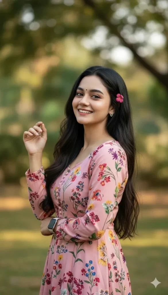 Create an ultra-realistic outdoor portrait of the same girl, preserving her complete facial identity with strict token-weighted accuracy. Her forehead shape, eyebrow density and curvature, eyelid depth, eye spacing, nose bridge and nostril geometry, lip shape and smile curvature, chin contour, jawline, cheekbone structure, natural skin texture, and micro-asymmetry must all remain fully unchanged from the reference. No beautification, slimming, smoothing, reshaping, or enhancement is allowed. Identity must remain exact. TOKEN-WEIGHTED IDENTITY LOCK • Face identity overall: 1.6 • Bone structure, cheekbones, jawline, chin: 1.5 • Eyebrows (shape, arch, density): 1.45 • Eyes (shape, spacing, depth): 1.55 • Eyelid folds: 1.5 • Nose (bridge, nostrils, tip geometry): 1.5 • Lips (fullness, curvature): 1.5 • Skin texture & micro-details: 1.5 • Natural asymmetry & expression authenticity: 1.45 POSE (MATCH EXACTLY) • Stance angled slightly to her right; torso facing forward. • Head gently turned left, creating a soft, open side-profile feel. • Smile bright and expressive, lifting cheeks naturally. • Eyes gaze slightly upward toward the left, creating a joyful candid expression. • Right arm hangs relaxed at her side. • Left arm bends at the elbow, lifting her left hand near her face with delicate finger spacing — identical wrist and fingertip posture as reference. • Flower tucked behind right ear — same placement, angle, and petal visibility. • Hair long, straight, flowing over both shoulders with a natural slight wave at the ends. OUTFIT (MATCH EXACT DESIGN — PINK FLORAL) • Long-sleeved pink floral dress. • Maintain identical botanical print layout: soft pastels mixed with brighter accents. • Preserve fabric fall, sleeve structure, waist flow, and natural folds. • Keep smartwatch on left wrist exactly as in reference — same size, color, strap reflection. ENVIRONMENT & LIGHTING • Softly blurred outdoor garden background — greenery, warm earthy tones, natural daylight glow. • Maintain shallow depth of field: face in crisp focus, background smooth and unobtrusive. • Lighting soft and natural, highlighting cheekbones, lips, and hair texture without altering facial features. FINAL REQUIREMENTS • Photorealistic outdoor portrait. • Zero modification to facial structure or identity. • Exact pose replication, especially left-hand gesture. • Correct flower placement, outfit texture, and accessory accuracy. • Natural, joyful expression preserved authentically.