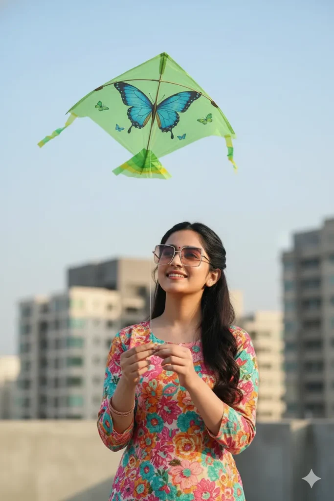 Create a high-resolution, ultra-photorealistic portrait where the provided reference image is used strictly and exclusively for facial identity preservation only. The woman’s facial identity must remain absolutely locked and unchanged, including exact face shape, forehead proportions, eyebrow thickness and arch, eye size, eye spacing, eyelid folds, nose bridge and tip structure, lip shape and smile curve, cheekbone placement, jawline contour, chin shape, and natural skin texture. Do not beautify, stylize, smooth, reshape, or alter the face in any way. Facial expression should remain soft, joyful, and naturally smiling, with realistic skin detail and true-to-life tones. The woman is standing outdoors on a modern urban rooftop during daytime, gently flying a kite while looking upward toward the sky. She is wearing a vibrant, floral-printed kurta featuring a lively mix of pink, orange, teal, yellow, and turquoise hues, with a traditional Indian ethnic pattern spread evenly across the fabric. The kurta has a modest neckline and long sleeves, fitted comfortably without appearing tight. Her hair is styled half-tied at the back with soft volume at the crown, while the rest of her long hair flows naturally over one shoulder in loose waves. She is wearing oversized square sunglasses with lightly tinted lenses and thin dark frames, sitting naturally on her face without distorting facial proportions. Minimal accessories are present, limited to simple bangles on one wrist, maintaining a clean festive look. In her hands, she is holding the kite string delicately, fingers positioned naturally as she controls the flight. Above her, a diamond-shaped paper kite is visible in the sky. The kite is light green in color and features a large central blue butterfly illustration with detailed wings, accompanied by smaller butterfly motifs on either side. The bamboo spine and cross spar of the kite are subtly visible beneath the paper, and a short layered tail in coordinating green and yellow tones hangs below the kite, fluttering gently. The background consists of softly blurred modern buildings with neutral concrete and glass textures, creating an urban cityscape that contrasts with the bright colors of the outfit and kite. The sky is clear and pale blue, with natural daylight illuminating the scene evenly. Lighting is soft and diffused, similar to late afternoon sunlight, highlighting fabric textures, hair strands, and facial contours without harsh shadows. The camera angle is slightly low and front-facing, framed as a medium portrait shot that captures the upper body, hands, and the kite above, creating a sense of upward motion and celebration. Depth of field is shallow, keeping the woman and kite in sharp focus while the background remains smooth and unobtrusive. No text, logos, watermarks, UI elements, filters, or graphic overlays should appear. Only the facial identity is taken from the reference image; all clothing, pose, accessories, environment, lighting, and background details are defined entirely by this prompt and must be followed exactly.