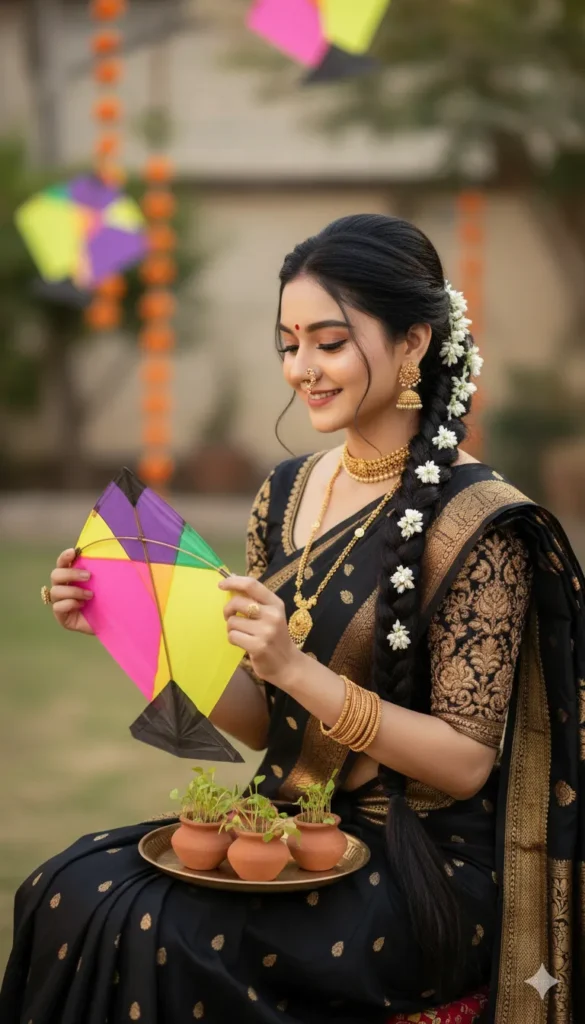 Create a photorealistic festive portrait where only the facial identity is taken from the provided reference image, preserved with absolute precision. Facial identity must remain unchanged, including head shape, forehead height, hairline position, eyebrow thickness and curvature, eye size and spacing, nose bridge and tip proportions, lip shape, jawline width, chin structure, natural skin texture, pores, and subtle asymmetry. No facial reshaping, smoothing, stylization, or artificial beautification is allowed. The face must blend naturally with the scene’s lighting, color tones, and shadows. The subject is shown in a graceful seated pose, positioned slightly angled to the camera. The upper body is turned gently toward one side while the head tilts downward and sideways, creating a soft, elegant profile view. The posture is relaxed and composed, with shoulders lowered and arms comfortably bent. The facial expression is warm, joyful, and serene, with a natural smile that reflects festive happiness rather than exaggerated emotion. The head position is slightly inclined forward, with the gaze directed toward the colorful kite held in hand. The neck is relaxed and elongated, enhancing traditional elegance. The eyes are not directly looking at the camera, creating a candid, celebratory moment. The hairstyle is recreated exactly: hair is neatly pulled back at the front and styled into a long, thick braid that falls over the shoulder. The braid is adorned with small white floral accents clustered near the braid, maintaining a traditional Maharashtrian aesthetic. The hair texture, volume, and placement remain natural and realistic. The outfit is recreated precisely from the target image. The subject wears a traditional black Nauvari-style saree with rich gold zari patterns and triangular woven motifs. The saree pallu drapes diagonally across the torso with realistic fabric folds and sheen. The blouse is black with heavy gold embroidery on the sleeves, featuring intricate floral and geometric designs. No outfit substitutions or modern styling changes are introduced. Traditional jewelry and accessories are present and accurate: a prominent Maharashtrian nath (nose ring), layered gold necklaces including a choker and longer pendant chain, detailed jhumka earrings, stacked bangles, rings, and a small bindi centered on the forehead. Jewelry reflects soft highlights and realistic metallic texture without over-glow. The subject is holding a traditional colorful kite, featuring bold geometric patterns in yellow, pink, purple, and green. The kite is held gently with both hands at chest level, angled slightly toward the face. The string and paper texture of the kite appear realistic, reinforcing the festive Makar Sankranti theme. In the foreground, a small brass plate with clay pots filled with green sprouts is placed near the subject, subtly reinforcing cultural symbolism. These elements remain secondary and softly focused. The background environment is an outdoor festive setting with decorative elements and colorful kites softly blurred in the distance. The background uses shallow depth of field to isolate the subject while maintaining contextual clarity. No modern or unrelated elements are introduced. The camera angle is positioned slightly above waist level, framed from mid-torso upward, allowing clear visibility of the saree drape, jewelry, braid, and kite. The composition follows a rule-of-thirds balance, keeping the subject visually centered yet dynamic. Lighting is natural daylight, warm and directional, likely during early morning or late afternoon. Soft sunlight illuminates the face and jewelry, enhancing skin tones and gold textures while maintaining gentle shadows. Subtle rim light separates the subject from the background, adding depth without harsh contrast. The final image should feel festive, culturally rich, elegant, and authentic, with strong realism, accurate traditional detailing, balanced composition, and flawless face identity preservation.
