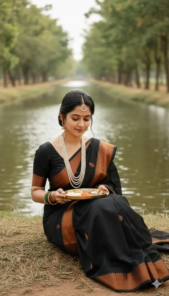 Create a high-resolution, ultra-photorealistic traditional Indian portrait where only the facial identity is taken from the provided reference image, preserved with absolute precision. Facial structure including forehead height, eyebrow thickness and curvature, eye shape and spacing, eyelid folds, nose bridge and tip, lip shape, cheekbone placement, jawline, chin length, natural skin texture, pores, and subtle asymmetry must remain unchanged. No facial reshaping, smoothing, beautification, or stylization is allowed. The face must naturally integrate with the scene’s lighting, shadows, and color environment. POSE & BODY POSITION The subject is shown in a full-body seated pose, placed centrally on natural earth near the edge of a calm lake. She sits gracefully on the ground with her legs folded to one side, posture upright yet relaxed. • Head gently tilted downward, eyes softly focused on the object in her hands • Right hand supports her body lightly on the ground • Left hand holds a small traditional plate (thali) at chest-to-waist height The pose conveys humility, tradition, and quiet emotion. OUTFIT (EXACT MATCH REQUIRED) She is wearing a black traditional saree with a rich copper-brown woven border featuring subtle ethnic motifs. The saree drape flows naturally across the seated posture with realistic fabric folds touching the ground. The blouse is black, short-sleeved, and fitted. ⚠️ No changes in color, pattern, texture, or drape are allowed. JEWELRY & WEARABLES • Layered white pearl necklaces, including a long strand resting down the torso • Traditional maang tikka centered at the hairline • Maharashtrian nath on the left nostril • Matching traditional earrings • Green and gold bangles stacked naturally on both wrists Jewelry reflects natural daylight subtly, with soft highlights and realistic shadows. HAIR & STYLING Hair styled in a traditional updo with volume at the crown. A few soft loose strands frame the face naturally. Hair placement must not obscure jewelry or facial features. PROPS & FOREGROUND ELEMENTS • Small festive thali containing traditional offerings such as white rice grains, flowers, and ceremonial items • Calm lake surface visible in the foreground and mid-ground with gentle ripples reflecting surrounding greenery • Water remains clean, still, and serene with no dramatic reflections or exaggerated highlights ENVIRONMENT & BACKGROUND Set in a lush rural grove beside a lake, with rows of trees forming a natural pathway along the water’s edge. The lake extends softly into the background, partially visible between trees. Background is naturally blurred using shallow depth of field. Earthy greens, browns, and muted water tones dominate the palette. LIGHTING Natural daylight, diffused and gentle. • Light enters from above and slightly from the side • Soft illumination on face, pearls, and saree border • Shadows remain smooth and realistic CAMERA & FRAMING • Camera angle: slightly low to eye-level • Shot type: medium-wide full-body seated portrait • Lens feel: 85mm portrait • Depth of field: shallow, subject sharply focused, lake softly blurred • Rendering style: cinematic editorial realism • Color grading: warm, earthy, natural ABSOLUTE RULES • Use only face identity from reference image • No changes to outfit, jewelry, pose, cultural elements, or mood • No fantasy elements, stylization, or reinterpretation • Output must visually match the target image, with the lake replacing shallow water only