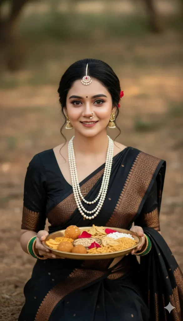 Create a high-resolution, photorealistic traditional Indian portrait where only the facial identity is taken from the provided reference image, preserved with absolute precision. Facial proportions including eye shape, eyelid folds, nose bridge and tip, lip shape, cheek structure, jawline, chin length, natural skin texture, pores, and subtle asymmetry must remain unchanged. No face reshaping, smoothing, beautification, or stylization is allowed. The face must integrate naturally with the scene’s lighting and color environment. The subject is framed in a medium close-up portrait, seated or slightly grounded in a natural outdoor setting. She faces the camera directly with a warm, gentle, confident smile, conveying a festive and welcoming emotion. The head is held upright with a soft, natural tilt, and the shoulders are relaxed. The posture is balanced and graceful, with both hands brought forward at chest level. Both hands are carefully holding a traditional brass festive plate (thali). The plate is filled with assorted traditional snacks and offerings, including round ladoo-like sweets, white puffed grains, dry snacks, and scattered red flower petals. The thali is centered, clearly visible, and naturally supported by both hands, with fingers gently curved under the rim. OUTFIT (MUST MATCH EXACTLY) The subject is wearing a black saree with deep brown and copper-toned woven borders, featuring traditional geometric and zig-zag motifs. The saree fabric appears rich and matte with subtle sheen in the borders. The blouse is black with short sleeves and fine textural detailing. The drape falls naturally across the torso with realistic folds and fabric weight. No alteration to color, pattern, or fabric texture is allowed. JEWELRY & WEARABLES (CRITICAL PRIORITY — EXACT REPLICATION) • A long, layered white pearl necklace with multiple strands hanging symmetrically with natural gravity. • A matching shorter pearl necklace near the collarbone. • A traditional Maharashtrian nath with subtle pearl detailing on the left nostril. • A maang tikka with white pearls and a central red stone, centered at the hairline. • A small red crescent-shaped bindi between the eyebrows. • Matching pearl earrings aligned evenly with the face. • Green glass bangles combined with gold bangles on both wrists, stacked naturally. All jewelry must be crisp, sharp, authentic, and proportionally accurate—no glow effects, blur, or exaggeration. HAIR & STYLING Hair is styled in a traditional updo, pulled back neatly with soft loose curls framing the face on both sides. Hair supports jewelry placement without covering facial features. BACKGROUND & ENVIRONMENT A natural outdoor earthy setting with warm browns and muted greens. The background is softly blurred with shallow depth of field. No additional objects or distractions. LIGHTING & COLOR Soft natural daylight evenly illuminates the face, jewelry, and thali. Highlights gently accent pearls, gold, and skin without harsh reflections. Shadows remain soft and realistic. CAMERA & RENDERING • Camera angle: slightly above eye-level • Lens feel: 85mm portrait • Depth of field: shallow • Rendering style: ultra-realistic, editorial • Color grading: warm, festive, natural ABSOLUTE RULES • Use only facial identity from reference image • Do not change jewelry, saree, pose, plate contents, or background • No artistic reinterpretation or stylization • Final image must match composition, emotion, and cultural accuracy exactly