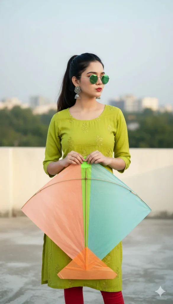 Create a high-resolution, ultra-photorealistic portrait where the provided reference image is used strictly and exclusively for facial identity preservation only. The facial identity must remain completely locked and unchanged, including exact face shape, forehead proportions, eyebrow thickness and arch, eye size and spacing, eyelid folds, nose bridge and tip structure, lip shape, smile curvature, cheek volume, jawline contour, chin structure, and natural skin texture. Do not beautify, stylize, alter age, slim, widen, or modify the face in any way. Preserve realistic skin pores, natural highlights, and authentic facial proportions exactly as present in the reference image. The subject is a young woman standing on an open rooftop terrace during soft daylight with a fresh, festive atmosphere. She is wearing a vibrant lime-green ethnic kurta made of textured fabric, featuring subtle floral embroidery motifs spaced evenly across the front. The kurta has a modest round neckline and three-quarter sleeves, paired with fitted red leggings visible below the hem. Her hair is styled in a neat high ponytail with smooth strands and soft flyaways, adding a casual festive elegance. She is accessorized with large traditional silver jhumka earrings, reflective green-tinted round sunglasses with thin frames, and bold red lipstick that contrasts sharply with the outfit. Her expression is confident and playful, lips slightly pursed while her head is turned gently to one side. She holds a large diamond-shaped paper kite in front of her torso with both hands. The kite is divided into clean geometric color blocks: soft peach on one side, mint blue on the opposite side, a bright neon-green vertical panel at the center, and a warm orange lower segment. The kite paper appears semi-translucent with thin bamboo sticks visible beneath, and the bottom tail area is folded neatly without long streamers. Her hands grip the kite edges naturally, fingers relaxed and well-posed. The background shows a softly blurred cityscape with dense green trees and distant buildings, creating depth without distraction. Lighting is natural and even, with gentle sunlight illuminating her face, outfit, and kite colors without harsh shadows. The camera framing is a medium portrait shot from the waist up, slightly angled from the front, using a shallow depth of field to keep the subject sharply in focus while the background remains creamy and diffused. No text, logos, watermarks, borders, UI elements, filters, or graphic overlays should be present. Only the facial identity is taken from the reference image; all clothing, accessories, pose, environment, lighting, and composition are fully defined here and must not be inferred from the reference image.