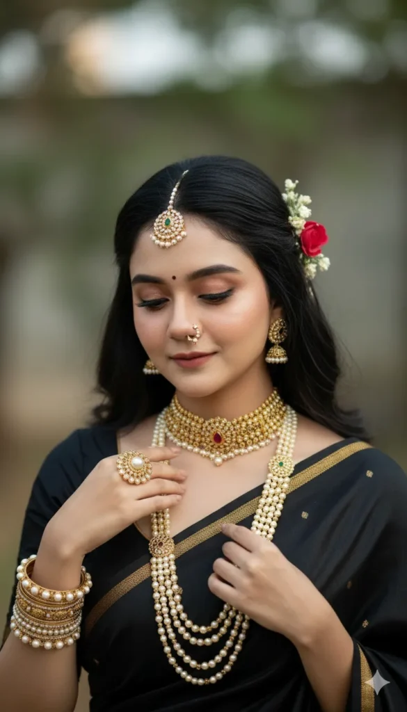 Create a high-resolution photorealistic traditional portrait where only the facial identity is taken from the provided reference image, preserved with absolute precision. Facial proportions, eye shape, eyelid folds, nose structure, lip curvature, cheek volume, jawline, chin length, skin texture, pores, and natural asymmetry must remain unchanged. No facial beautification, reshaping, smoothing, or stylization is allowed. The face must integrate naturally with lighting and shadows. The composition is a tight medium close-up, intentionally framed to place maximum visual emphasis on traditional jewelry and adornments. The subject’s face, neck, collarbone, and hands dominate the frame, with jewelry occupying the primary focal zones. The subject’s head is gently tilted downward, eyes softly lowered, creating an elegant and serene expression that naturally directs attention toward the jewelry. The smile is subtle, refined, and calm—never exaggerated. The gaze is downward, not toward the camera, enhancing intimacy and sophistication. JEWELRY PRIORITY (CRITICAL FOCUS) • A heavy traditional gold choker necklace sits snugly at the base of the neck, featuring dense gold texture, micro-engraving, and a central red gemstone accent. • A long layered pearl necklace drapes gracefully over the chest, with symmetrical spacing, natural gravity, and visible thread structure between pearls. • A Maharashtrian nath (nose ring) with pearl detailing and a red stone, aligned precisely with the nostril and facial contour. • A traditional maang tikka centered on the forehead with pearl framing and a green central stone, aligned exactly with the hair parting. • Matching earrings, bangles, and a statement ring, each rendered with accurate metal reflectivity, gemstone refraction, and realistic wear. Jewelry must appear crisp, sharp, and dominant, with natural micro-highlights. No artificial glow, blur, or softness is allowed on jewelry. HANDS & INTERACTION Both hands are raised gracefully near the chest, lightly touching and adjusting the necklace strands. Fingers are relaxed and elegant, with bangles and ring clearly in focus. Nail color remains natural and subtle. OUTFIT The outfit remains unchanged: a traditional black saree with gold border and matching blouse. Fabric texture, weave, and folds are realistic but visually secondary to the jewelry. HAIR & STYLING Hair is styled traditionally with partial pull-back and soft volume. Pearl and floral hair accessories are visible near the back and sides, complementing the jewelry subtly. LIGHTING (JEWELRY-OPTIMIZED) Soft natural daylight creates gentle highlights on gold, enhances pearl roundness, and preserves dimensionality without harsh shadows or blown highlights. BACKGROUND & DEPTH Softly blurred greenery background with shallow depth of field. Jewelry and face remain tack-sharp. CAMERA & RENDERING • Camera: eye-level to slightly above • Lens feel: 85mm portrait compression • Rendering: ultra-realistic, editorial quality • Color grading: warm, elegant skin tones with rich gold highlights